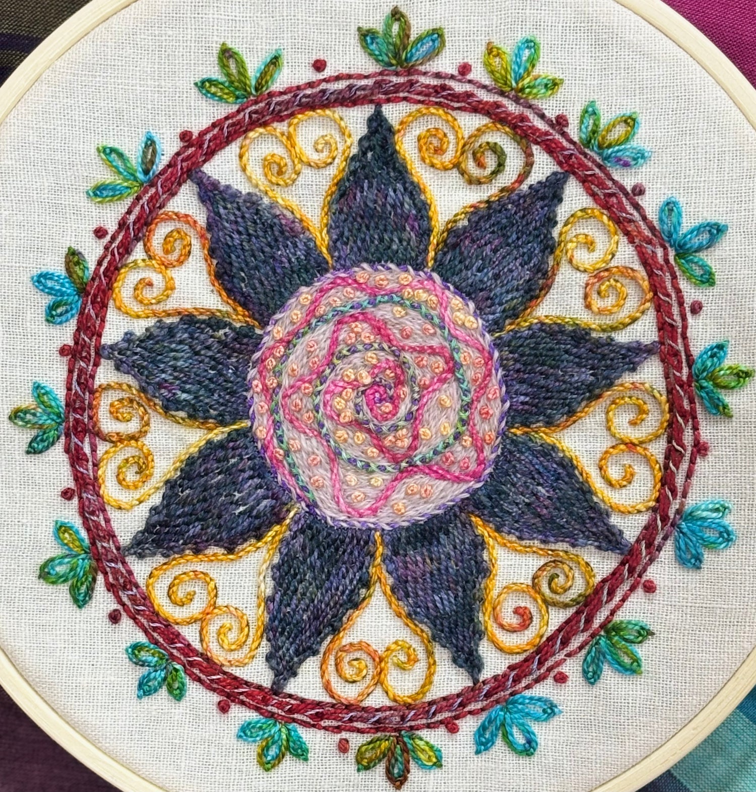 My workshops are informal and filled with laughter, offering a chance to learn a new skill and meet new friends. In these workshops, I guide participants in transferring designs onto fabric of choice, introduce them to a variety of threads and fibers, and teach various needlepoint stitches. They also learn to think creatively and not to fret over perfection.