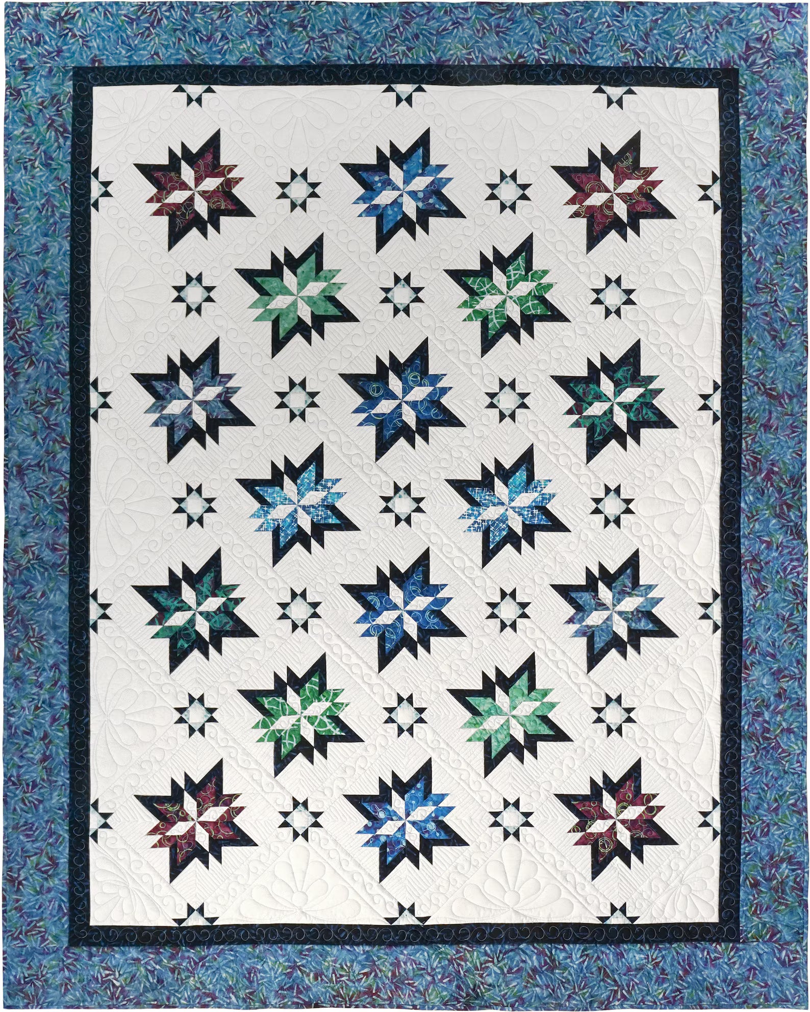 This beautiful was designed to showcase the Island Batik line of fabric Squiggles, Lines and Dots, by Studio 180 Designs. The feature star in this quilt is created by combining both the Blazing Lemoyne and Banded Lemoyne Star points. Using the Rapid Fire Lemoyne Star™ Tool by Studio 180 Design, construction is a breeze. The points are strip pieced, with no templates and no "y" seams. A great way to showcase what this tool can do.