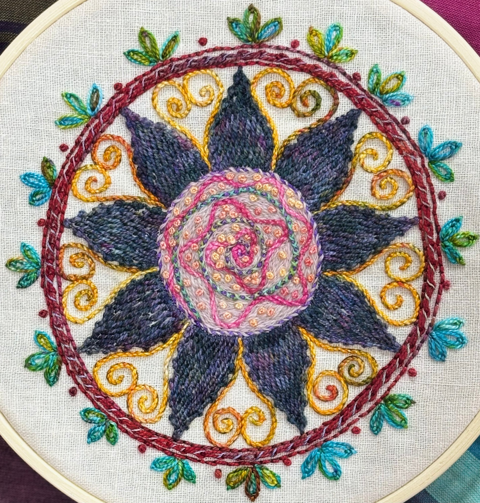 A wonderful workshop for the Intermediate Embroiderer. This is a next step to the Strata Sampler for Beginners workshop. Here we will use approximately 7 stitches to create this beautiful Mandala block that I designed. You may not finish your Mandala by the end of the workshop but you will go home with the confidence to continue to the finish. If you are interested in this workshop you must be confident in basic embroidery and know how to stitch a Back Stitch, Running Stitch and Chain Stitch. You will learn a Colonial Knot, Berry Stitch, Short/Long and Couching. You will work with Perle Cottons and Silk or Crewel Wool If you are a beginner please consider signing up for my Strata Sampler Workshop first!